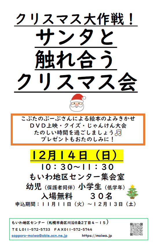 - FAXでお申込みの方は「参加者名」「年齢」「連絡先」「クリスマスリース、お正月リース、しめ飾りのいずれか」を明記して(011-572-5744)へ送信ください。